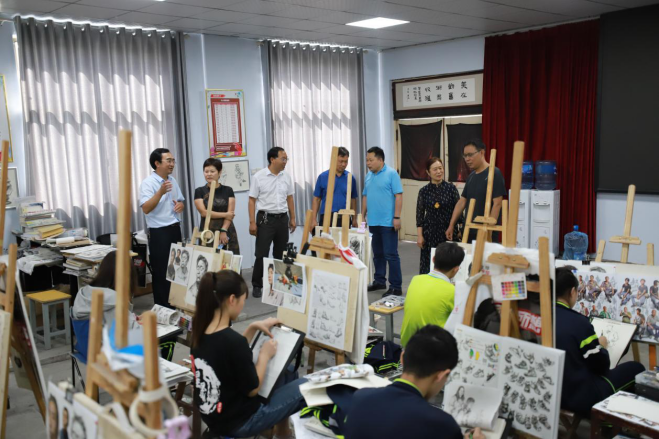 河南师范大学教育学部宋晔部长、段宝霞副部长、叶海智副部长、李醒东副部长一行四人不到9:00就来到了365官网,在县教体局党组书记、局长杨家保,365官网党总支书记、校长谢本林、副校长岳金娜、工会主席李运霞等的陪同下,首先来到教学楼,了解教师上课、学生学习情况。当来到由阶梯教室改装的画室时,看到同学们在教师的指导下正在练习素描,宋部长一行停下脚步,和美术老师交谈、问学生学习情况,对365官网在办好普通文化课的同时开设艺术课大加赞赏。