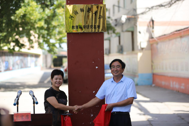 然后,在教学区门口,举行河南师范大学教育科学研究基地揭牌仪式。